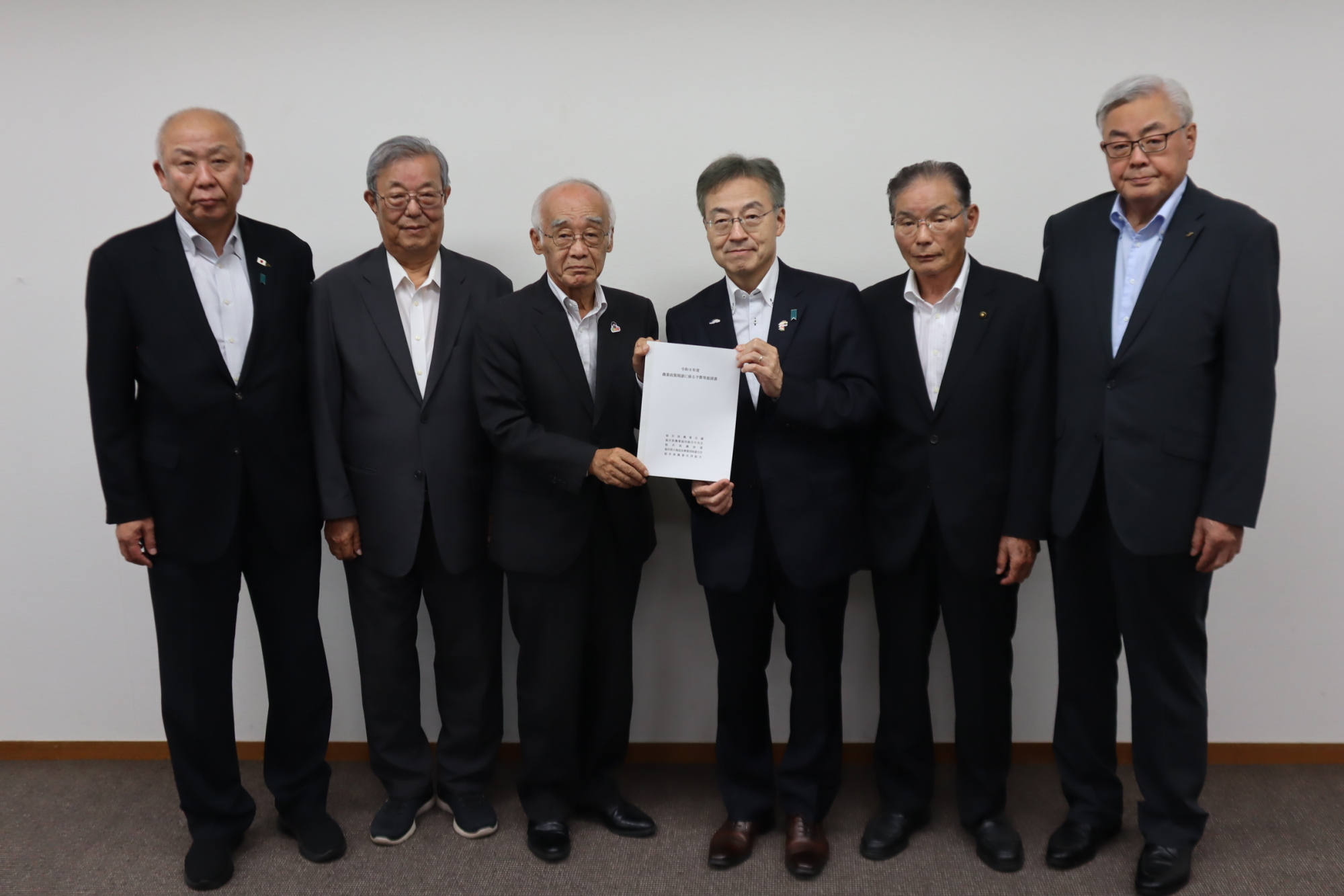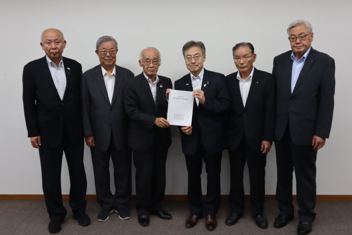 福井県農政連・JA福井県中央会など県内農業関係5団体は9月6日、県庁にて農業政策の令和7年度予算について杉本知事に要請を行いました。この要請は県選出国会議員に対する要請と同じく今回で4回目となります。今年改正された「食料・農業・農村基本法」に基づく5年間の基本計画が定められ、農業の構造転換が進められようとしているなかで、県農業会議・JA福井県中央会・県土地改良事業団体連合会・県農業共済組合・福井県農政連の5団体の代表が重要課題10項目の要請を行い、要請書を手渡しました。